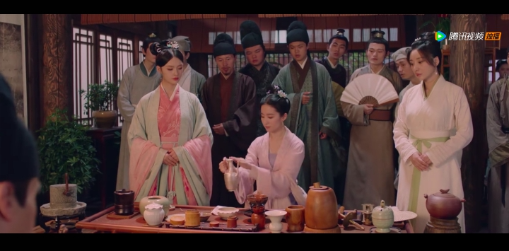 △电视剧《梦华录》中,刘亦菲饰演的“女一号”赵盼儿与茶楼掌柜斗茶的场景。(图片来源:《梦华录》剧照)