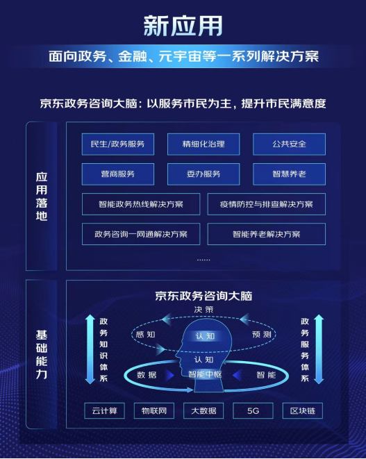 在政务领域,言犀发布了政务咨询大脑,定位是以服务市民为主,旨在提升市民满意度、幸福感。基于言犀在智能对话与交互领域的前沿技术,加上言犀在政务服务方面的积累而形成的。在底层,通过人工智能、云计算、大数据等基础技术能力,打通政务知识体系和政务的服务体系,实现了动态感知、运行监测、决策支撑、联动指挥的功能,广泛的应用在民生服务、精细化治理、委办服务等领域。基于这些能力的积累,京东政务大脑也逐渐形成了多个解决方案,包括政务热线解决方案、疫情防控与排查解决方案、政务咨询一网通解决方案、智能养老解决方案。