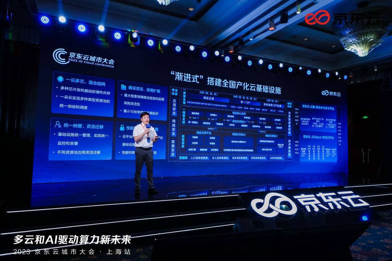 在京东云的技术支持下,上海普陀区通过“一云多芯、混合组网”的技术架构,搭建混合多云资源池,实现不同资源池应用的灵活迁移,渐进式推进一网统管国产化替代。