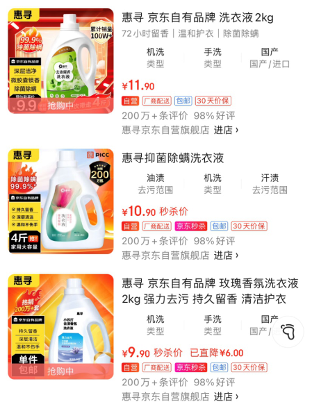 截至目前,惠寻的多款明星洗衣液均收获了超过200万条的真实好评,在京东同类产品的排行榜中,多次霸榜销冠。